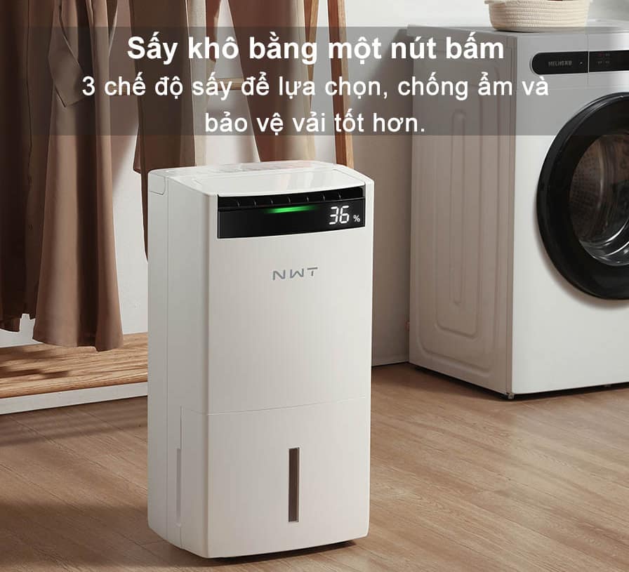 Máy hỗ trợ nhiều chế độ hoạt động, bao gồm chế độ hút ẩm tự động, chế độ sấy quần áo và chế độ hẹn giờ, đáp ứng đa dạng nhu cầu sử dụng trong gia đình.
