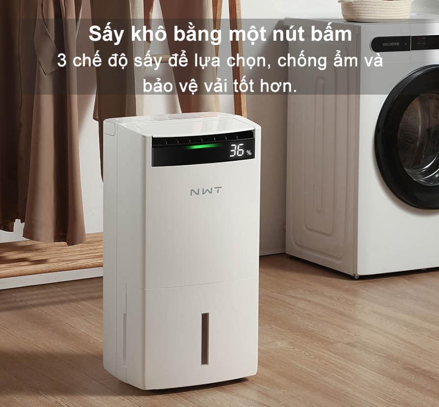 Máy hỗ trợ nhiều chế độ hoạt động, bao gồm chế độ hút ẩm tự động, chế độ sấy quần áo và chế độ hẹn giờ, đáp ứng đa dạng nhu cầu sử dụng trong gia đình.