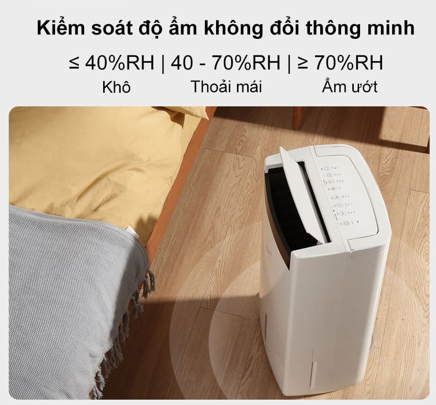 - Công suất hút ẩm mạnh mẽ: Với khả năng hút ẩm lên đến 24 lít/ngày, máy phù hợp cho không gian lên đến 90m², giúp giảm độ ẩm nhanh chóng và hiệu quả.