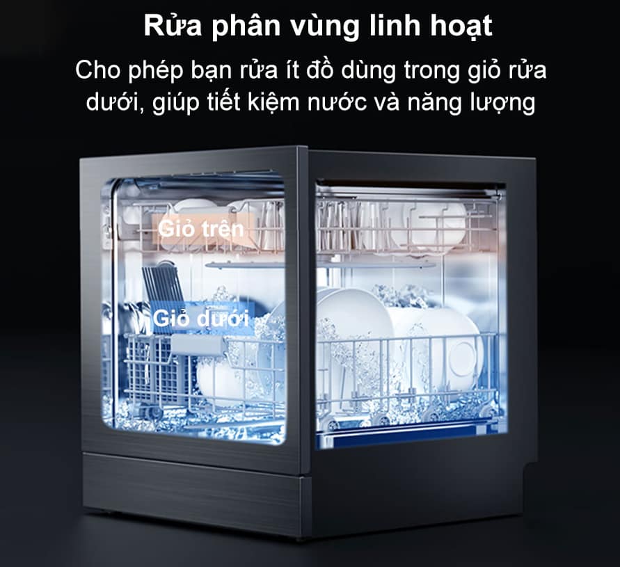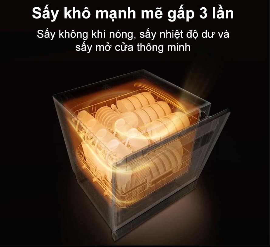 - Sấy khô nhanh chóng: Kết hợp giữa sấy khí nóng, sấy nhiệt độ dư và sấy mở cửa tự động, hiệu suất sấy tăng lên đến 18%, giúp chén bát khô ráo nhanh chóng.