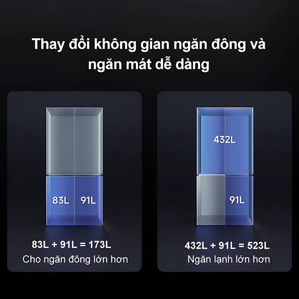 Tủ lạnh Xiaomi Mijia có khu vực biến đổi nhiệt độ rộng 91L. Dung tích tối đa cho ngăn đông là 174L và ngăn lạnh là 523L. Các bác có thể tuỳ chỉnh dung tích từng ngăn dễ dàng để trữ thực phẩm theo mùa vụ.
