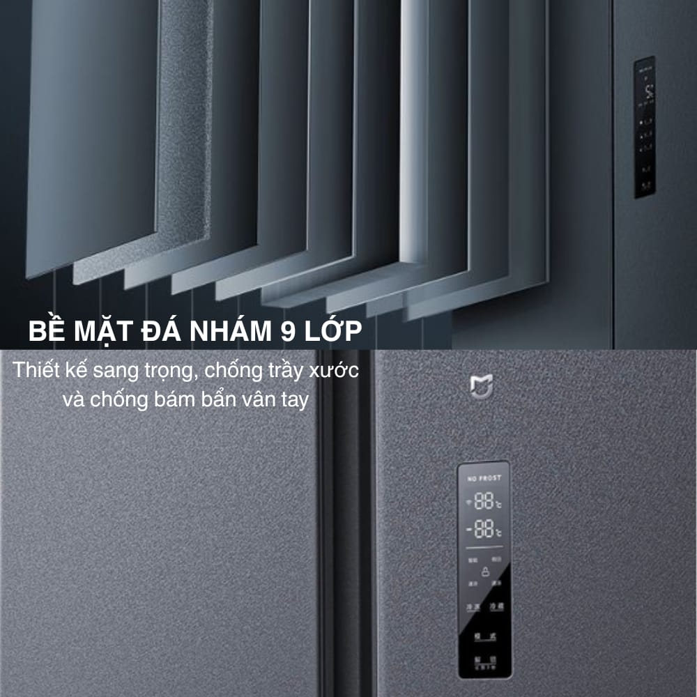 Tủ lạnh 4 cánh Xiaomi có bề mặt giống như đá tự nhiên.. Bề mặt tủ có độ bóng mịn, sang trọng đặt không gian nào cũng đẹp các bác ạ. Được làm từ 9 lớp vật liệu đặc biệt và ứng dụng công nghệ ion hiện đại nên tủ rất cứng cáp, chống trầy xước và bám bẩn vân tay. Ngoài ra, phần đá còn kết hợp với kim loại nên các bác có thể dán nam châm lên như trên bảng từ – vừa tiện vừa đẹp.