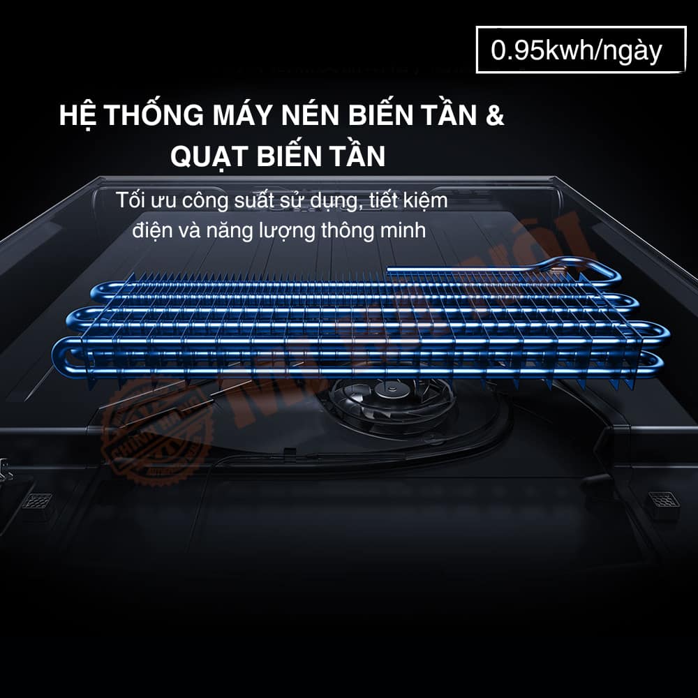 Tủ lạnh xiaomi 4 cánh 606L có thể tự động điều chỉnh công suất theo nhu cầu (biến tần): khi ít đồ thì chạy nhẹ, lúc cần làm lạnh nhanh thì tăng lực. Không chạy hết công suất suốt như mấy tủ đời cũ dùng máy nén 1 tần số cố định. Nên em này rất tiết kiệm điện. Chỉ 0.95kwh/ngày tương đương 80.000đ/tháng tiền điện.