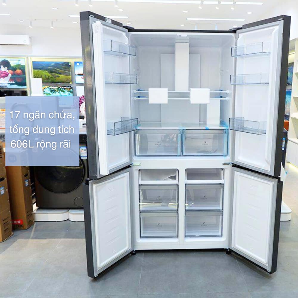 - Dung tích lớn 606L với thiết kế 4 cánh chia ngăn thông minh
