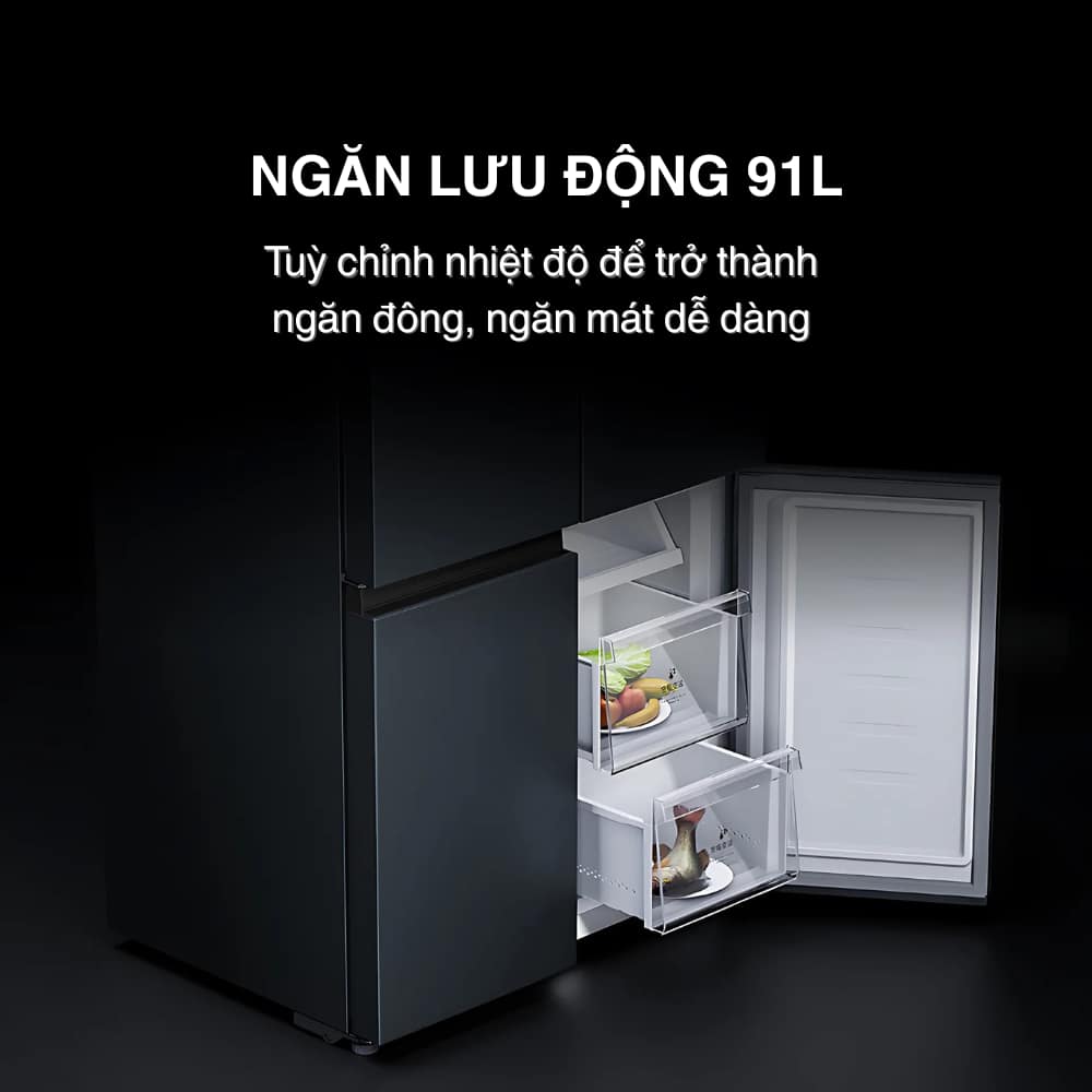 - Ngăn lưu động: 91L, nhiệt độ tuỳ chỉnh từ -20°C đến 5°C thành ngăn lạnh, ngăn đông hoặc đông mềm