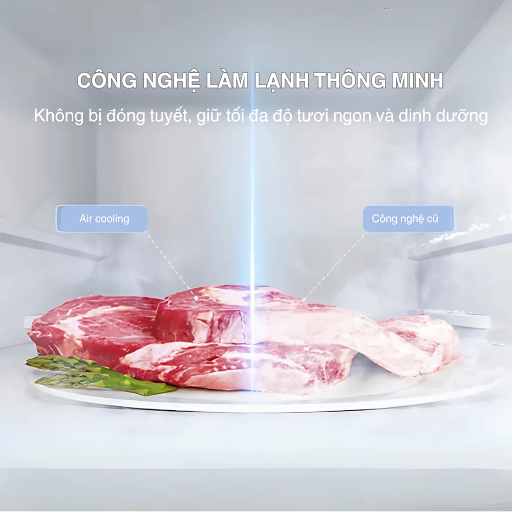 Tủ được trang bị công nghệ làm lạnh 360°, thổi khí lạnh đều khắp mọi ngóc ngách. Nhờ đó, nhiệt độ luôn ổn định, không có chỗ nhiệt quá thấp hay quá cao. Quan trọng là không bị đóng tuyết, nên các bác khỏi phải mất công cạy đá, dọn tủ. Thực phẩm đông nhanh nhưng không dính chùm vào nhau.