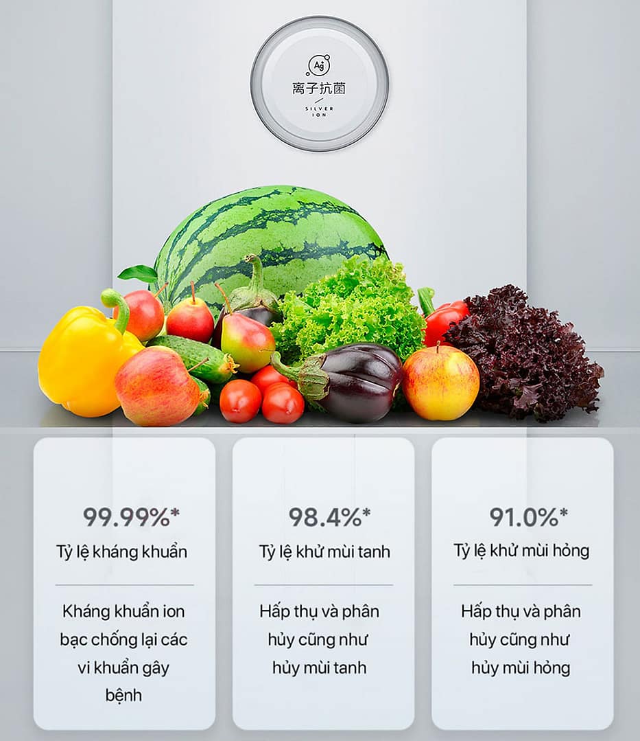 Ion Bạc vẫn là 1 công nghệ khử mùi & diệt khuẩn cực kỳ tốt các bác ạ! Theo hãng công bố thì tủ lạnh xiaomi 606L diệt khuẩn tới 99,9%, khử mùi 97.9%. Loại bỏ hiệu quả các vi khuẩn gây hại như E. coli và tụ cầu vàng cũng như các mùi khó chịu của thịt, cá hoặc các loại thực phẩm nặng mùi.
